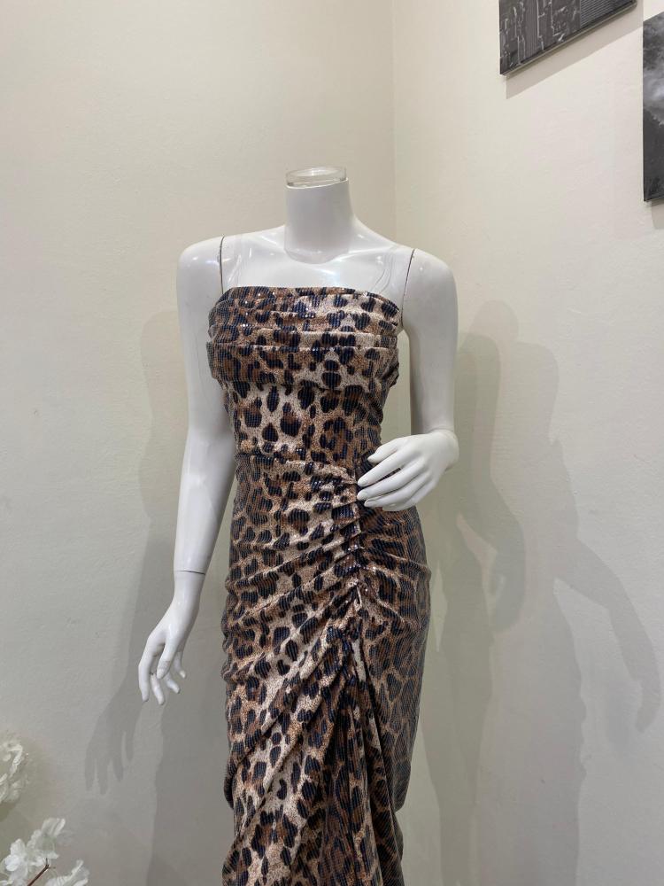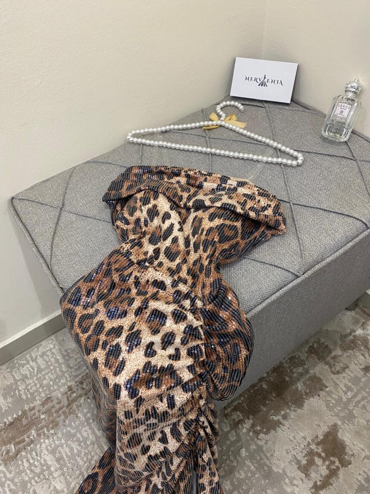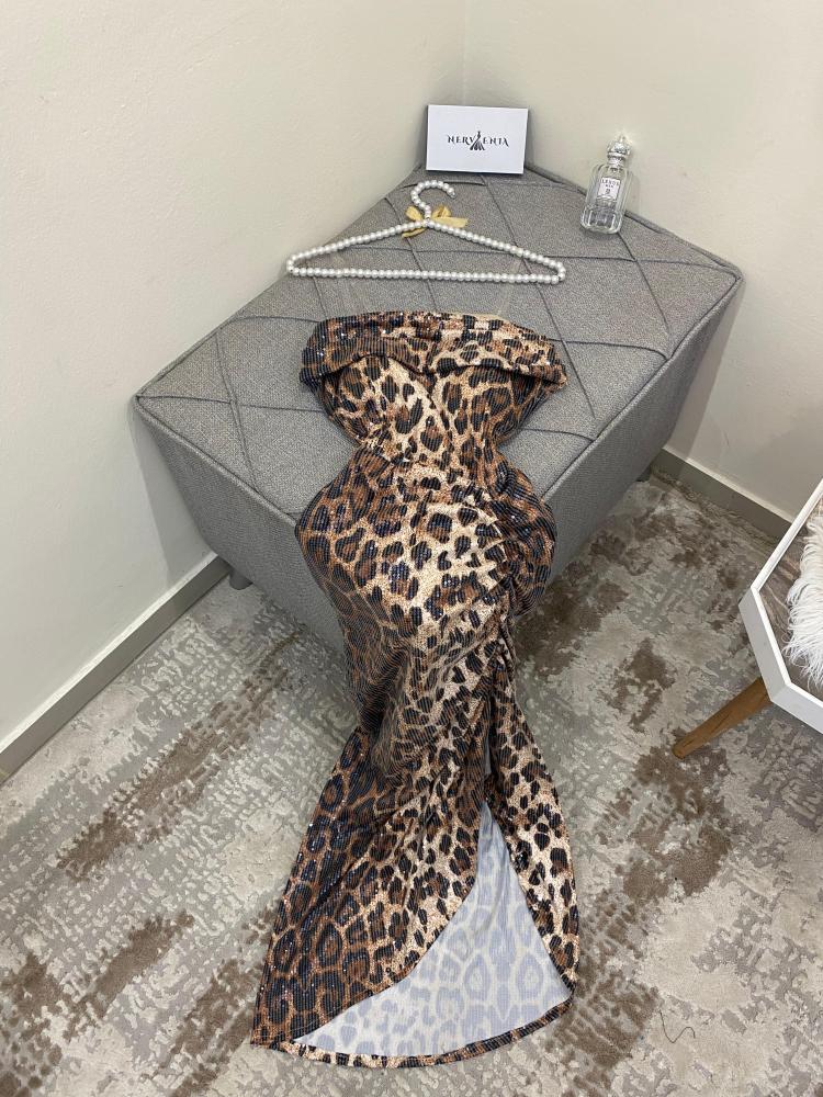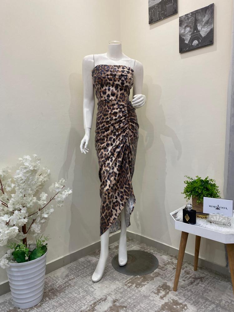 - اللون والنقشة: يتميز الفستان بنقشة جلد الفهد الكلاسيكية، وهي نقشة جريئة وأنيقة تمنحكِ مظهراً عصرياً وجذاباً.