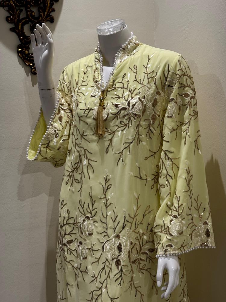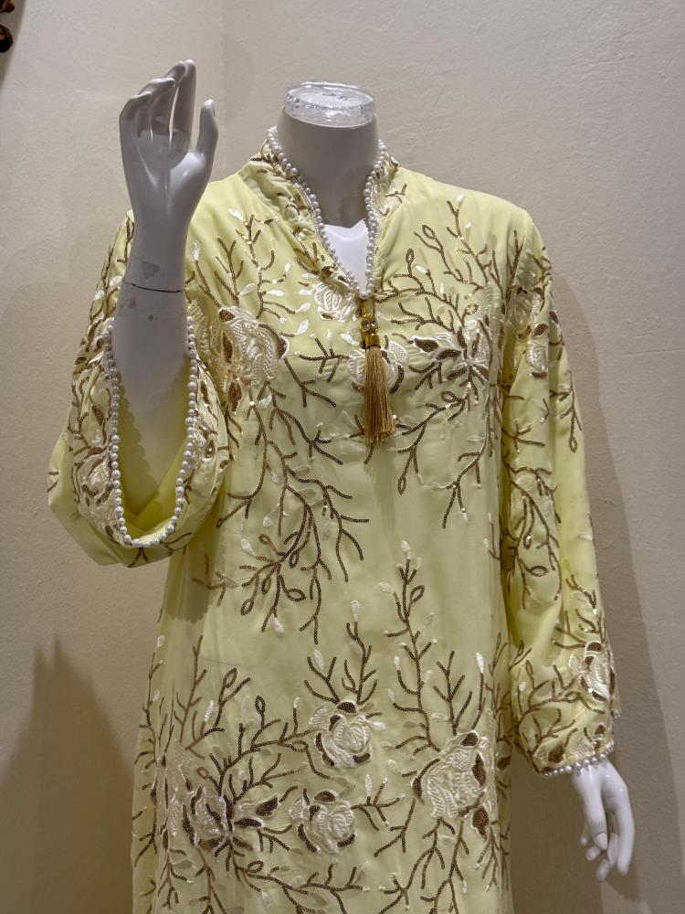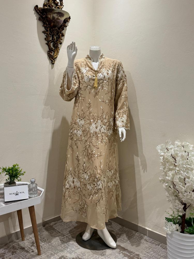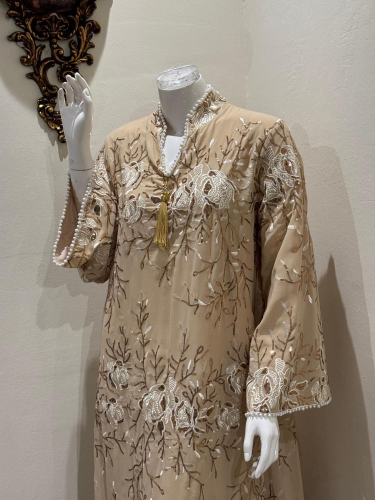 جلابية اوراق خريفية بياقة مطرزة باللؤلؤ