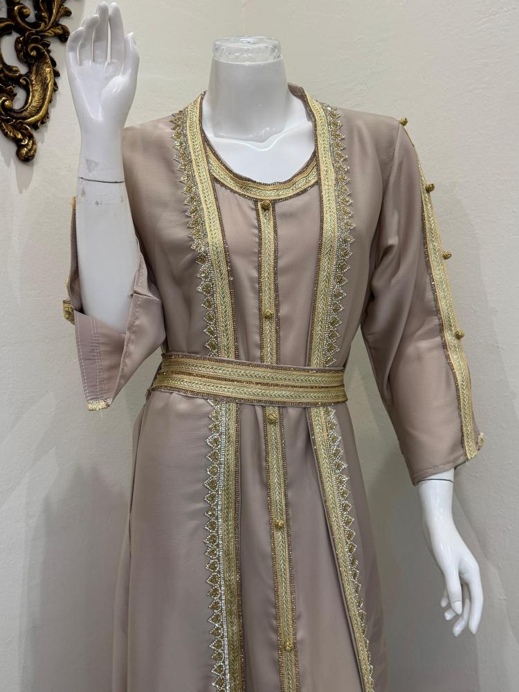 جلابية قطعتين بتطريز ذهبي فاخر مع حزام