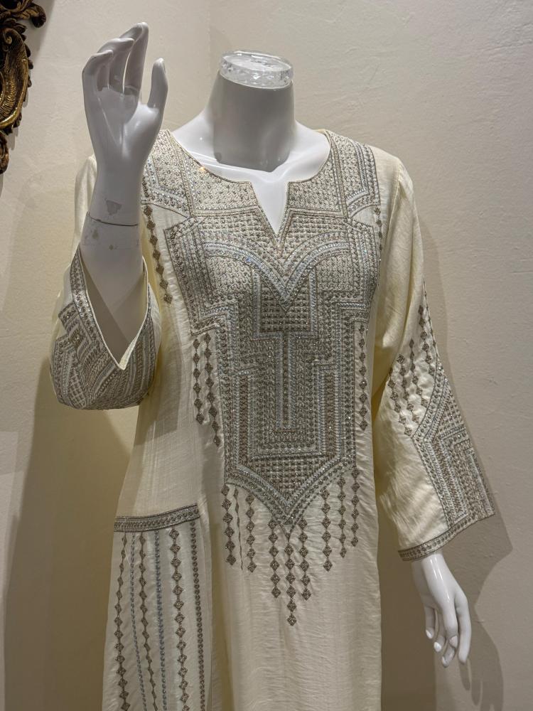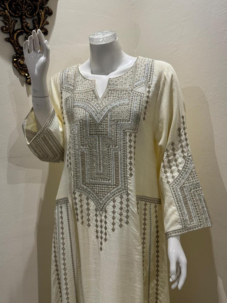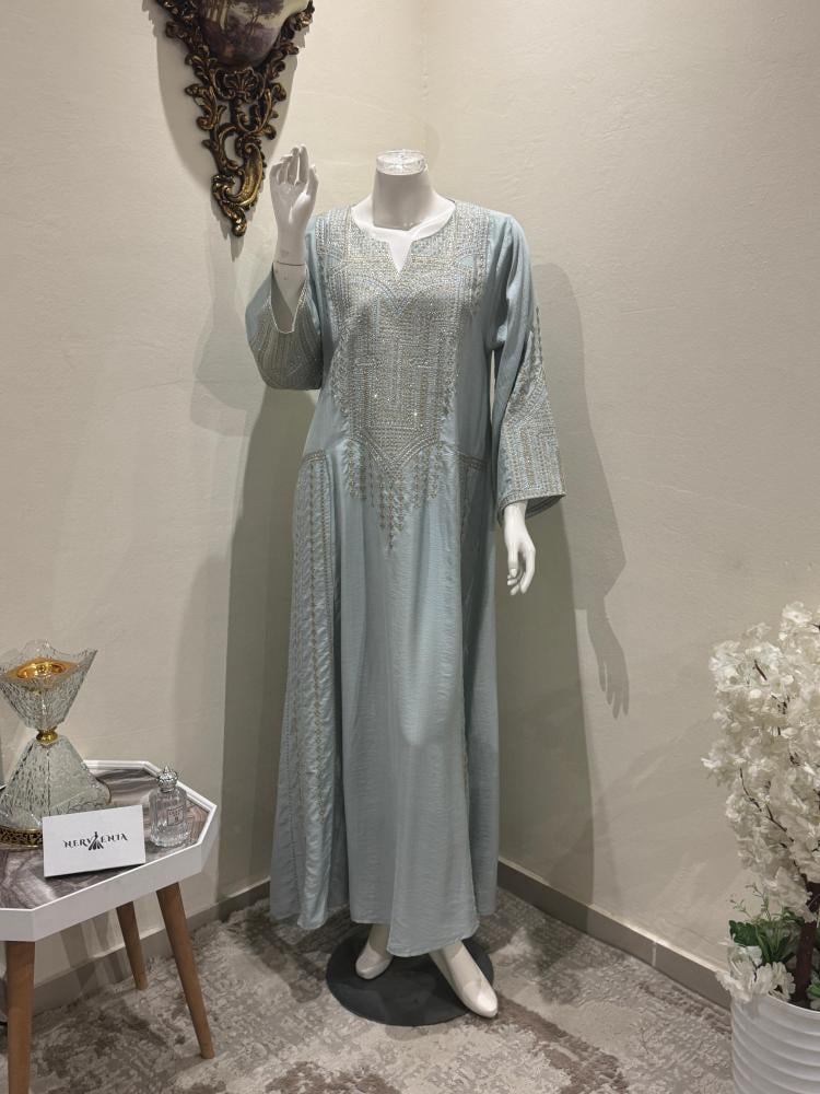 جلابية ملكية بتطريز فاخر يعكس الفخامة والرقي، مصنوعة من قماش ناعم وانسيابي يضفي لمسة من الأناقة الكلاسيكية. تصميم مثالي للمناسبات الخاصة أو لإطلالة راقية في المنزل 💙.