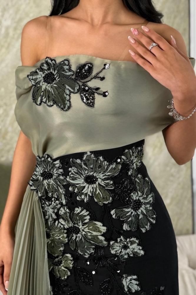 - التفاصيل: تطريز فخم بالأزهار السوداء والزيتوني الممزوجة بالترتر على الخصر والجزء السفلي لإبراز الإطلالة.