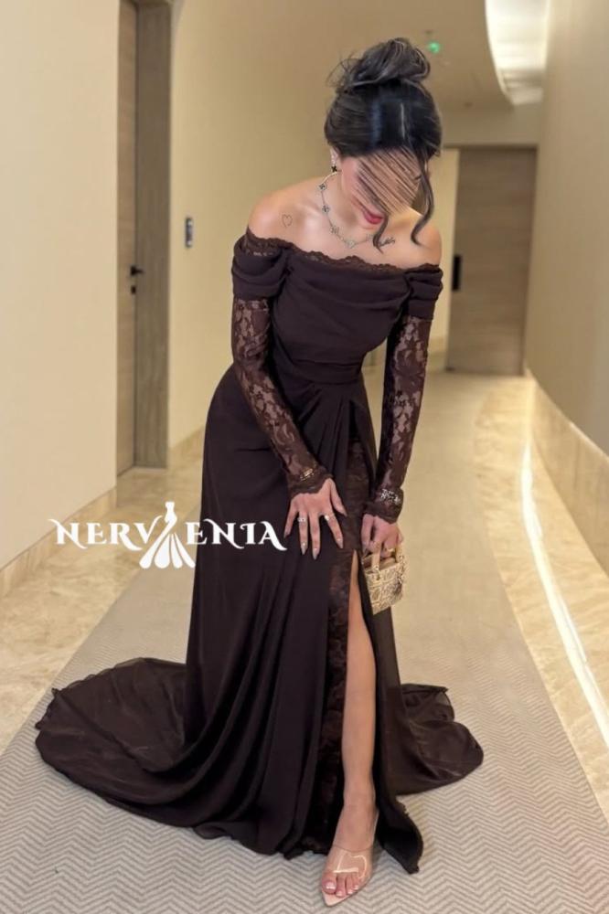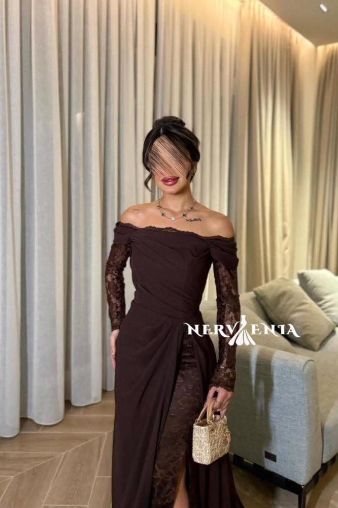 صُمم هذا الفستان بقصة "أوف شولدر" تبرز جمال الكتفين والرقبة، مع أكمام طويلة من الدانتيل الفاخر برسمه دقيقة تضفي لمسة من الأنوثة والرقي.