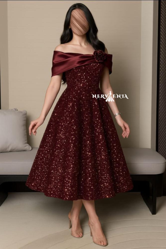 أناقة ملكية تتجسد في هذا الفستان الميدي بلون العنابي العميق. يتميز بتصميم الأكتاف المنسدلة من قماش الساتان وزخرفة الترتر اللامع على كامل الجسم. مثالي لإطلالة تخطف الأنظار في مناسباتك الخاصة.