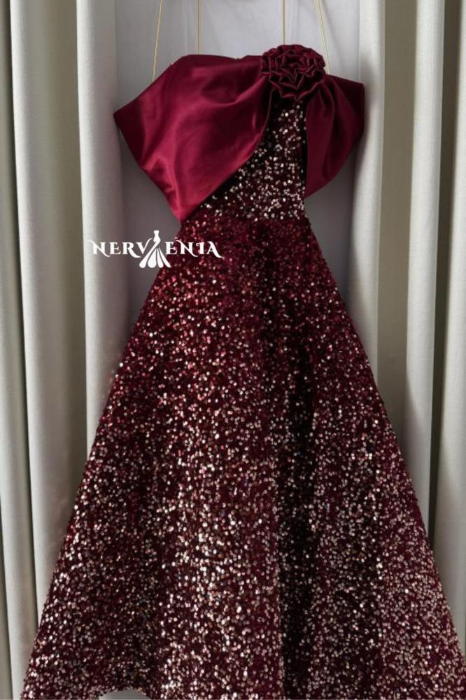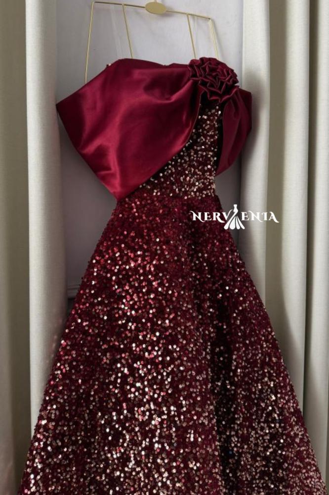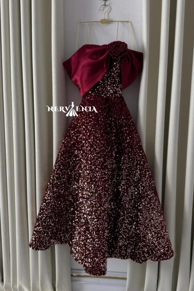 فستان سهرة عنابي ميدي ساتان وترتر