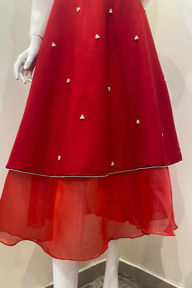 هذا الفستان الأحمر ما هو فستان عادي، هذا فستان سهره يخطف الأنظار من أول نظرة! تصميمه راقي وجذاب، الصدر مضغوط بطريقة تبرز القوام، مع حمالات رفيعة مرصعة بأناقة تضيف لمسة فخامة. الطبقة العلوية من اسفل الخصر فيها تفاصيل ناعمة وتطريزات صغيرة تضيف لمسة فنية وذوق راقي، والطبقة السفلية من الجازار الشفاف اللي تعطي حركة ناعمة وانسيابية مع كل خطوة.