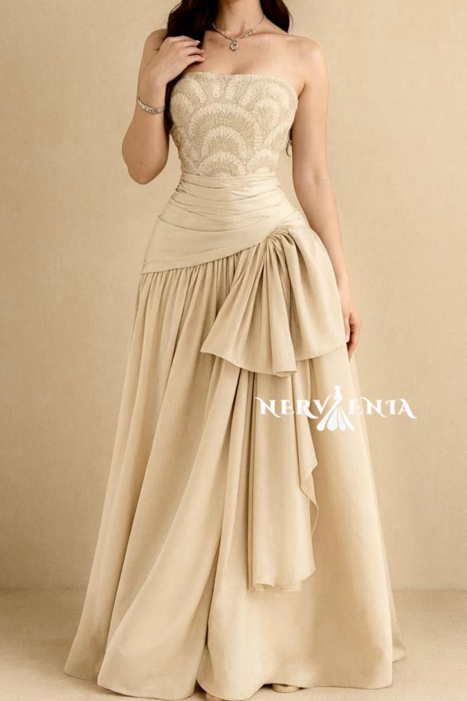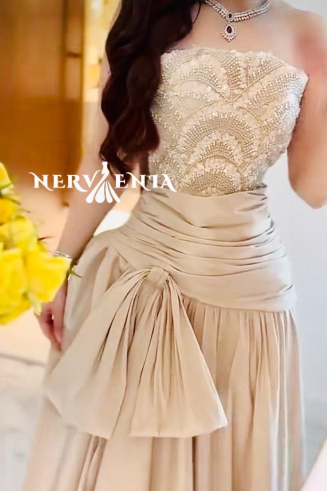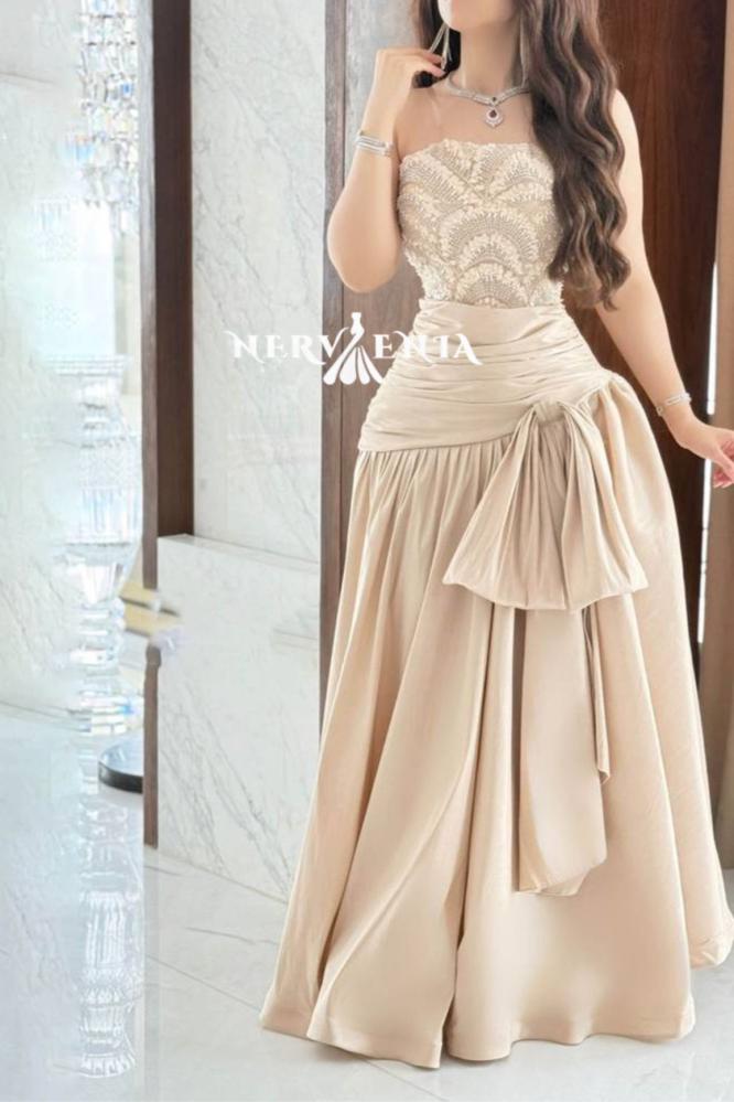 فستان ندى جولد يتميز قماش شانطون بتصميم ملكي أنيق جدًا، باللون البيج الذهبي الفاتح الذي يضفي لمسة فاخرة وراقية.