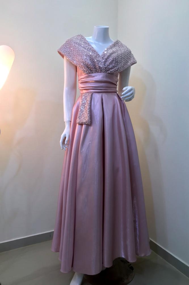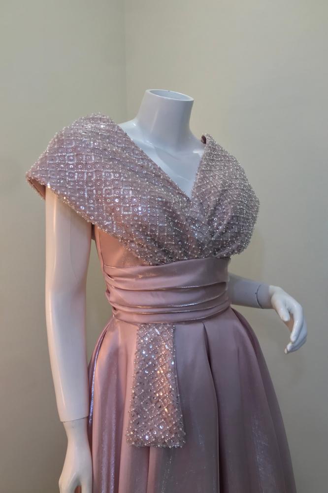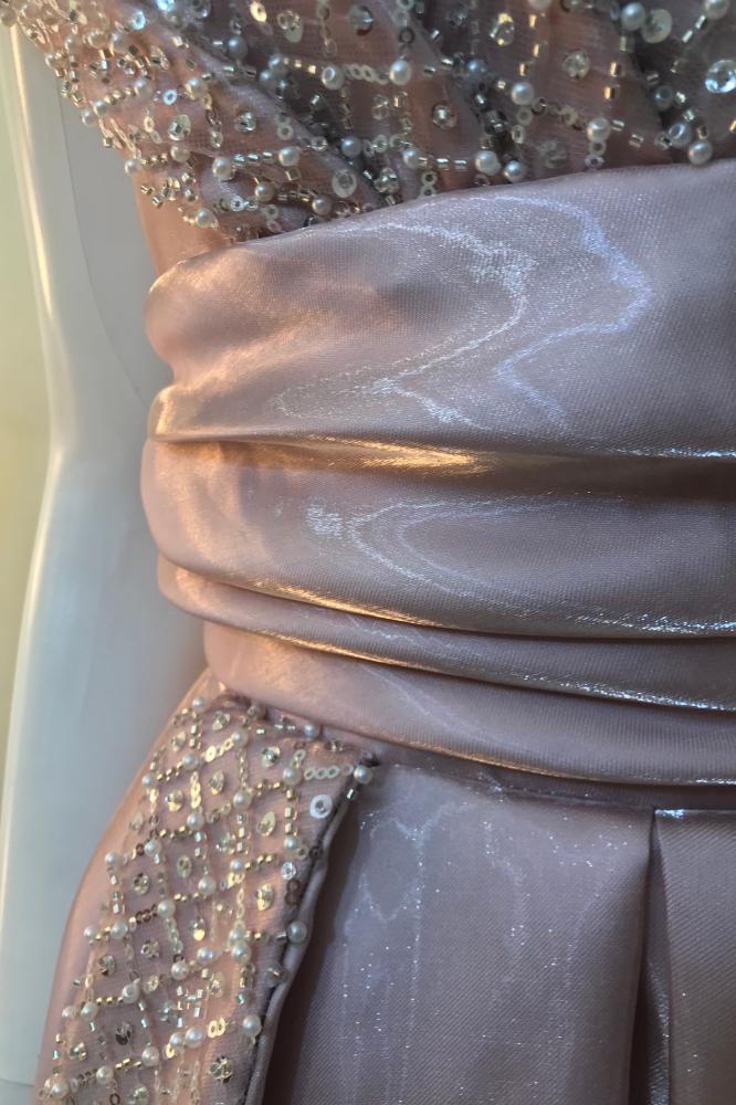 • التطريزات: الجزء العلوي مغطى بتطريزات براقة مصنوعة من خرزات لامعة بتصميم شبكي، تضفي لمعانًا ولمسة من الفخامة على الفستان، وتناسب مناسبات السهرات والمناسبات الخاصة.