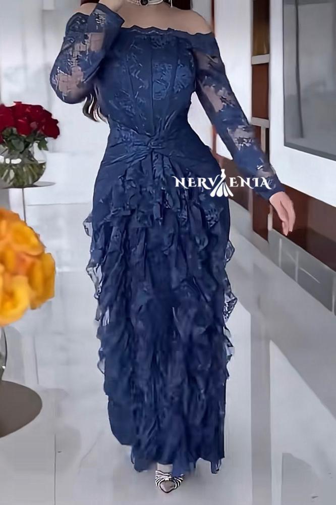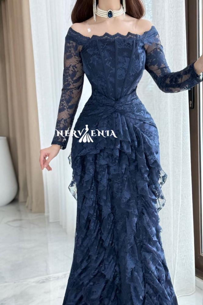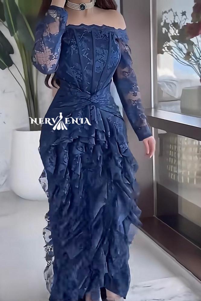 * قصة مميزة: يتميز بقصة مكشوفة الكتفين (Off-the-Shoulder) مع أكمام طويلة من الدانتيل الشفاف، مما يضفي لمسة أنثوية جذابة وراقية.